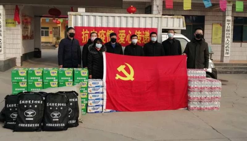 2月8日,华中集团党委代表来到顺平县腰山镇,为该镇防疫工作人员送来防寒服、方便面、牛奶、矿泉水等物资,并将2万元人民币交于南腰山村干部手中,用于疫情防控工作。