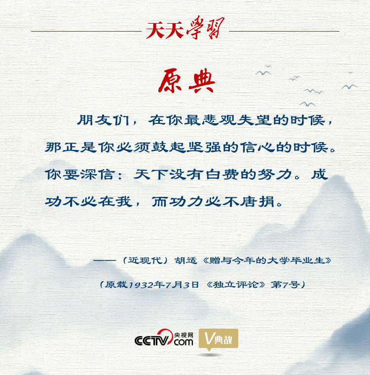 “功成不必在我”“功成必定有我”出自1932年胡适在北大毕业典礼上的讲话《赠与今年的大学毕业生》,原文为“成功不必在我,而功力必不唐捐”。