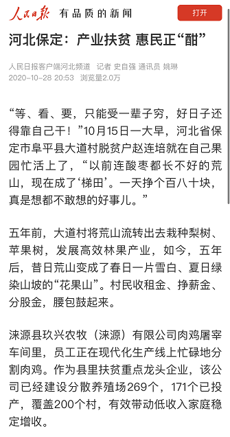 人民日报客户端10月28日刊发《河北保定:产业扶贫 惠民正“酣”》,以我市阜平县大道村脱贫户赵连培和涞源县玖兴农牧(涞源)有限公司为例,综合报道保定把发展产业作为脱贫增收的根本之策,作为高质量可持续发展的基础支撑。截至2019年底,保定市1104个贫困村全部出列,9个贫困县全部脱贫摘帽。