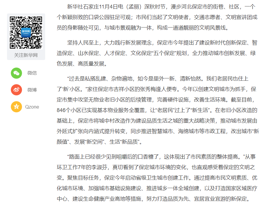宣传思想工作与发展同行,与城市共进。宣传是生产力、媒体是生产力,高品质的新闻宣传报道也是生产力。为充分展示我市经济社会发展亮点工作,即日起,保定日报推出特别栏目——“高端媒体看保定”,集纳中央和省级媒体刊登的反映我市城市转型、产业转型、脱贫攻坚等内容的重点稿件,广泛凝聚各方共识,全力推动保定创新发展、绿色发展、高质量发展。