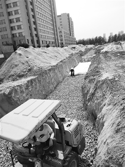 在绿化带修建前,工人提前在地下铺设了滤水石。