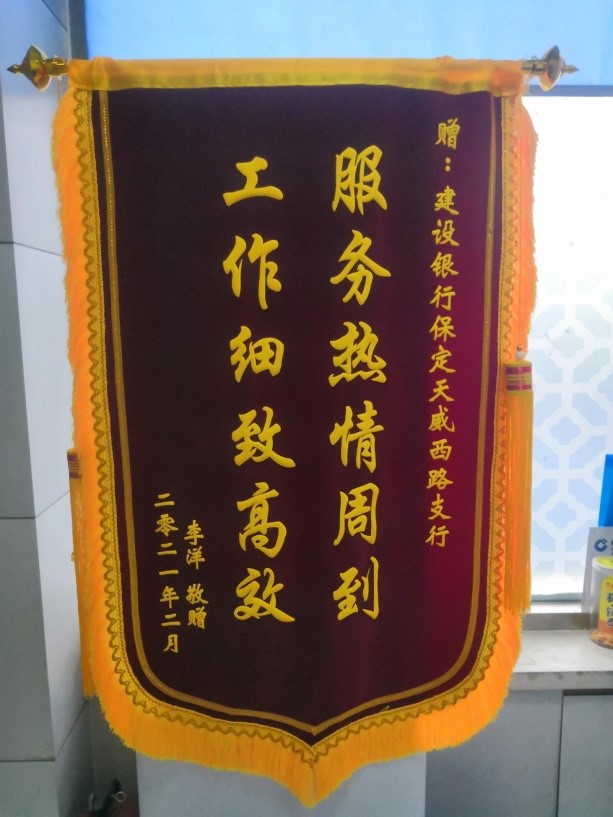 建行保定天威西路支行表示,客户的锦旗既是对支行工作的肯定,更是最好的鞭策。支行将继续用实际行动诠释金融温度,不辱使命、砥砺前行。