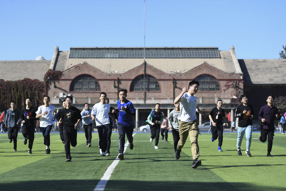 ↑2020年10月13日,在清华大学西大操场,大一新生在体育课上折返跑。