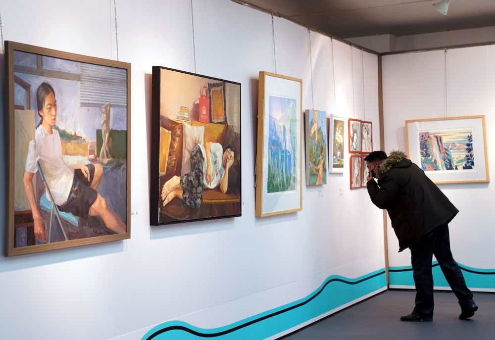 ↑2020年12月15日,参观者在上海图书馆观看大学生绘画作品。当日,来自上海40多所高校的大学生艺术作品及艺术实践工作坊项目进行展示、展演,展示了上海高校的艺术教育和大学生美育的阶段性成果。