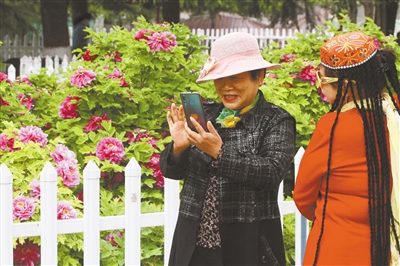 在保定市动物园,市民沉醉于牡丹“花海”。