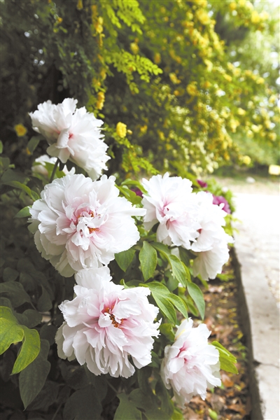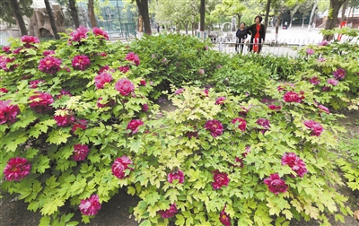 市民在竞秀公园牡丹园区散步。