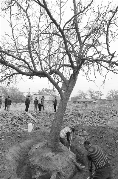 老树移植现场,工人正在做移植前的准备。 翟志刚 摄