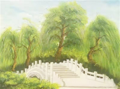 2020年疫情暴发后,离画室最近的竞秀公园成为廖明德老师固定的采风地点。从那时起,廊亭一角古色古香、小桥流水韵味十足、杨柳飘拂春色满园……公园里的各种景致被他捕捉并创作成画,每一幅画都仿佛让人身临其境。廖明德作画速度不快,“猜他画的是什么”成了围观市民的一大乐趣。