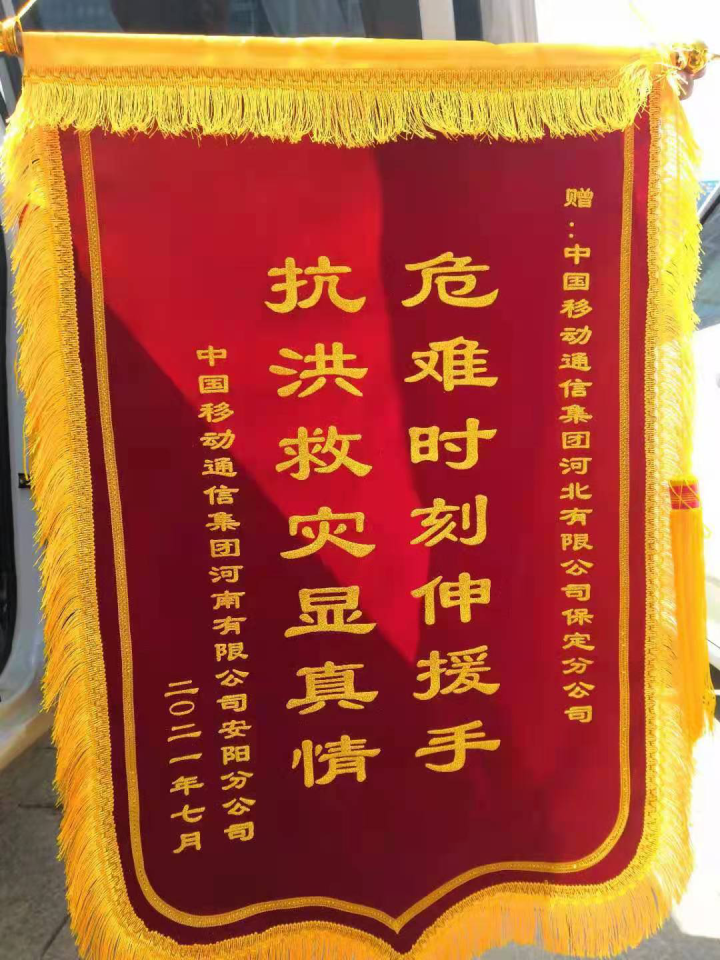 河南安阳移动公司为保定移动公司驰援抗洪赠送锦旗