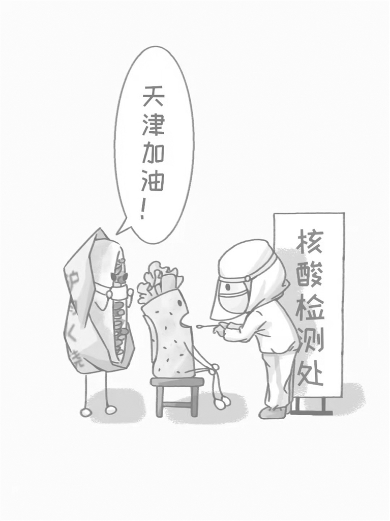 这几幅漫画出自河北大学的三名女学生张璇、胡岩竑、张净儒之手。“我们都是校媒成员,在疫情防控期间,我们想尽一份力,通过漫画来表达战胜疫情的决心。”来自法学专业的大一学生张净儒说出三人画漫画的初衷。“我的家乡在吉林,在保定求学的这个学期,我已经把保定当成第二故乡。这些天关注天津疫情,看到医务工作者在零下环境下为市民做核酸检测,社区干部、教育工作者,甚至更多普通市民也投入到紧张的防疫志愿工作中。作为一名大学生,虽然没有多深的绘画基础,但还是想通过这种简单明了的漫画形式来尽一份力。”