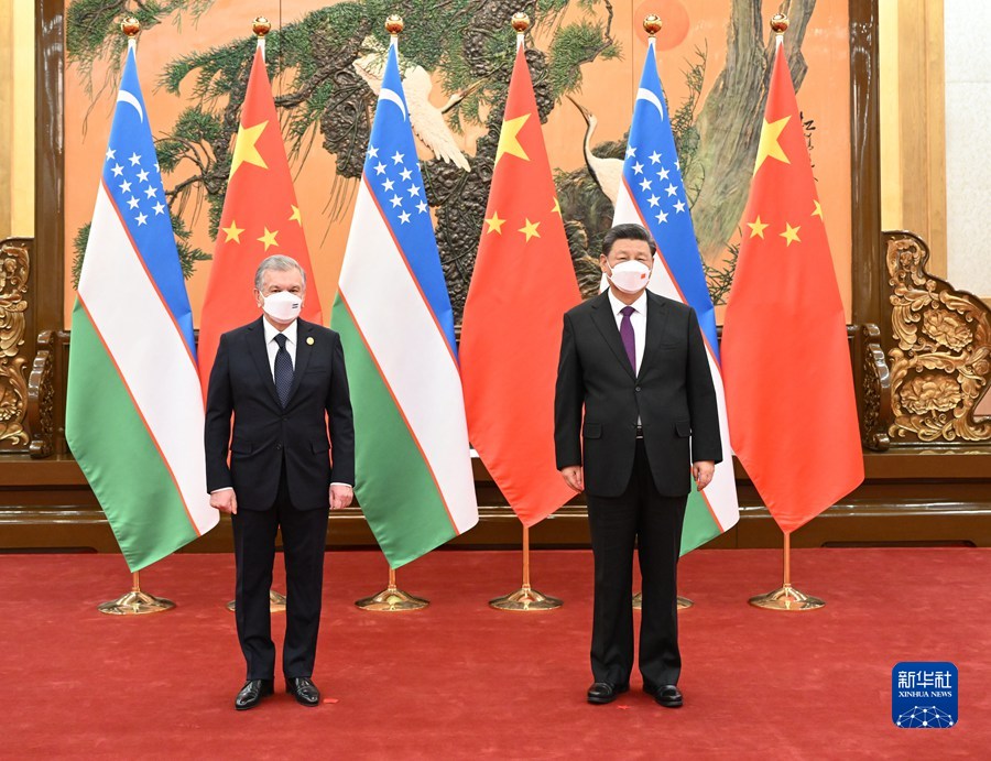 2月5日下午,国家主席习近平在北京人民大会堂会见来华出席北京2022年冬奥会开幕式的乌兹别克斯坦总统米尔济约耶夫。新华社记者 申宏 摄