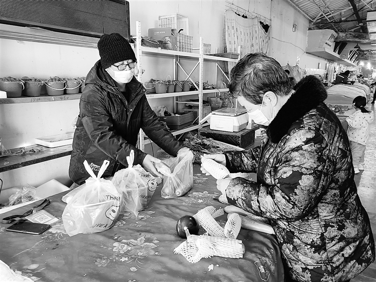 都晓天耐心帮助顾客挑选蔬菜。 摄影 陆征