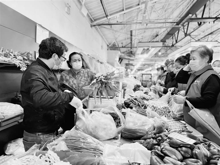 从早上6点开始,来买菜的人便一直不断。60岁的李阿姨今天没有买菜,但依然来到都晓天的菜摊儿前看看。“我一早就出来了,这不第一天解封吗,出来遛个弯儿。昨天在网上订了不少菜,今天不买了,但也来看看。这几年都买他的菜,他到哪儿卖菜我就跟到哪儿,菜的分量不少还便宜,大家都信他。”