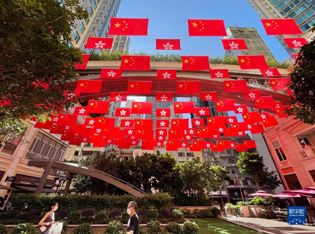在港岛利东街,在九龙尖东街头及柏丽大道,五星红旗和紫荆花区旗挂满街头,在蓝天白云映衬下格外鲜艳,路过的市民抬头便可见到一片“中国红”。不少香港市民拍下照片、视频发到网上,受到网友好评:“场景太震撼了”“振奋人心”……