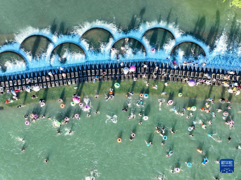 7月12日,湖南省永州市道县梅花镇贵头村,人们在洑水河里享受清凉(无人机照片)。