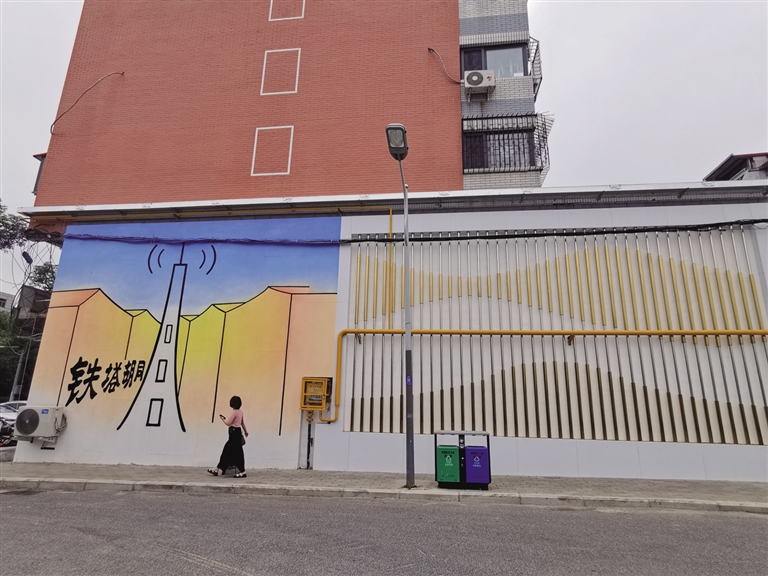 记者从五四路向南走进铁塔胡同,看到路东侧的墙面上,巨幅的彩色铁塔墙画以及格栅装饰,格外吸引行人的目光。电业局小区的一道铁艺围墙重新进行了粉刷,蓝、白、灰三色相间,面貌整洁一新。