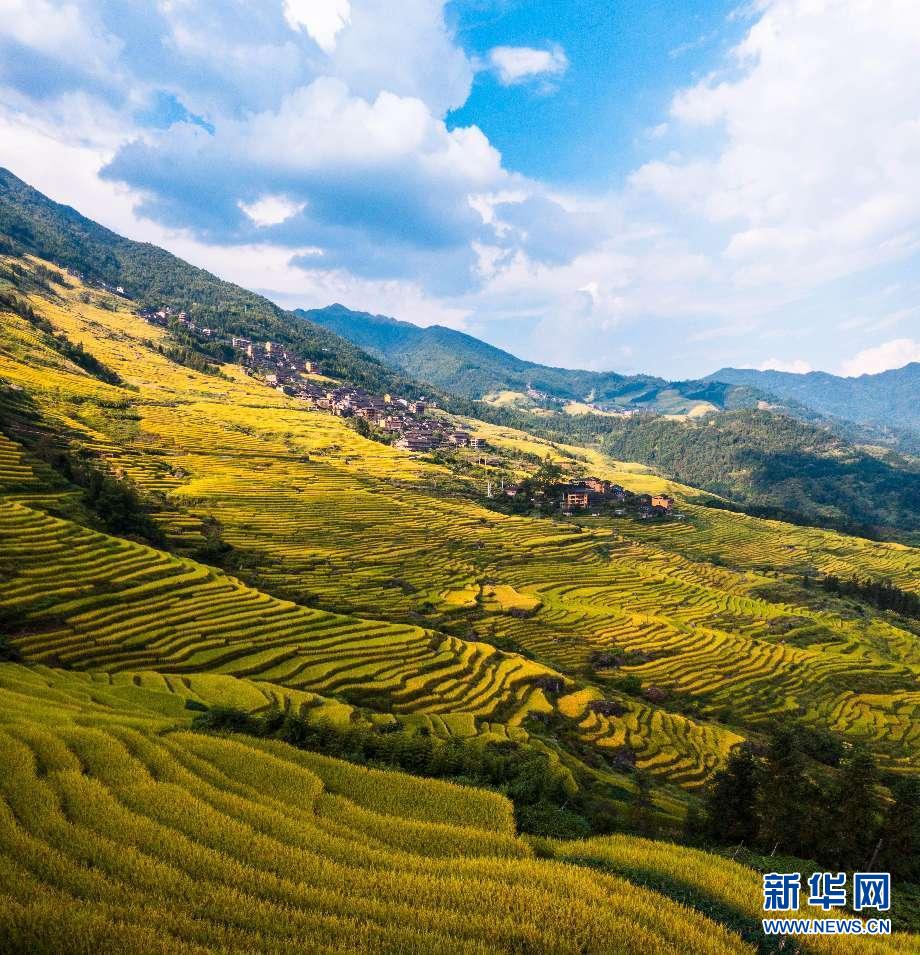 近日,广西桂林龙胜龙脊古壮寨梯田观景区800亩早稻逐渐成熟。和煦的阳光,凉爽的轻风,近处梯田一片金黄,远处天空一片蔚蓝,经过充分光合作用的稻穗,收获就在眼前。 (何诚蹊)