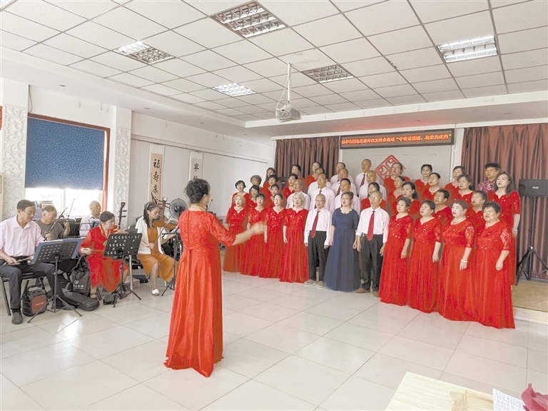 在嘹亮的合唱声中,鑫和花园居民欢聚一堂迎中秋。 杨紫钧 摄