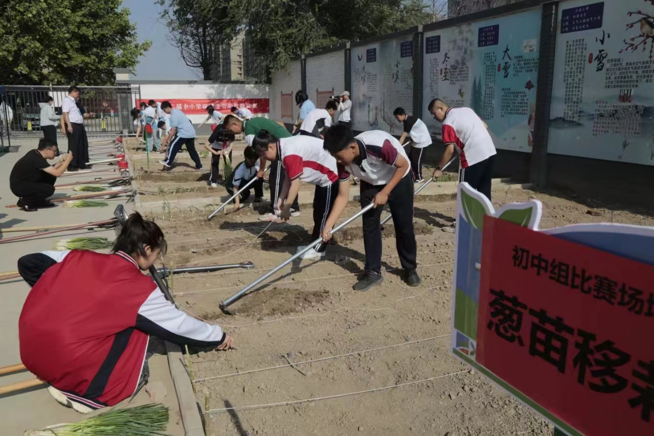 初中组学生正在进行农耕类葱苗移栽项目的比赛。