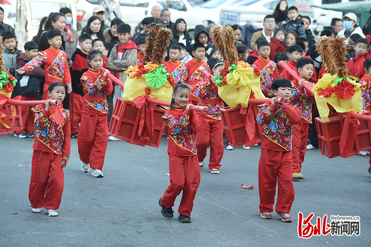 2月15日,邢台市南和区小学生在社区表演省级非遗抬黄杠,欢欢喜喜过大年。河北日报记者 赵永辉摄