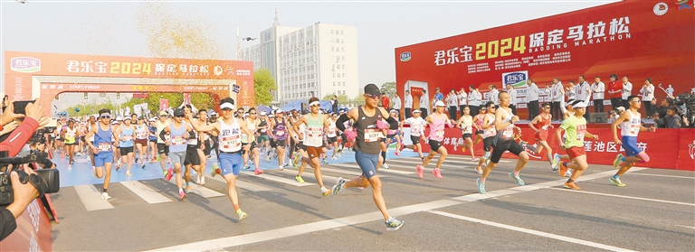保定晚报讯(记者孟丽)时隔一年,万名跑者再战保马,最美赛道热血重燃。4月21日上午7:30,君乐宝2024保定马拉松鸣枪开跑。来自6个国家、33个省区市的2万名选手,奔跑在如诗如画的环城水系最美赛道,尽情感受奥运冠军之城的风采。市委书记党晓龙,中华全国体育基金会副理事长、秘书长彭维勇,市委副书记、市长闫继红,省体育局副局长田建功,君乐宝乳业集团党委书记、董事长兼总裁魏立华,国家体育总局社会体育指导中心原副主任、中国毽绳协会主席杨善德,市委副书记王伟,世界轮滑联合会副主席、亚洲轮滑联合会主席蔡永军,市人大常委会主任李双喜,市政协主席李俊岭,市委常委、秘书长单有高,游泳奥运会冠军钱红,射击奥运会冠军庞伟共同为选手鸣枪。王浩、单勇、张晶、任洁、范晔、杜鹏宇、李悦、葛杨、吴咏梅、王大力、闫宇峰、佟怡臻、张君、陈荣、张新华、宋程等保定籍世界冠军、全国冠军到场助阵。