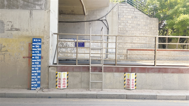最大限度保障人民群众生命财产安全,桥下快车道顺向右侧,还装有逃生爬梯。如车辆误入积水较深处,被困人员可通过逃生爬梯,快速进入地势较高的慢车道脱困。