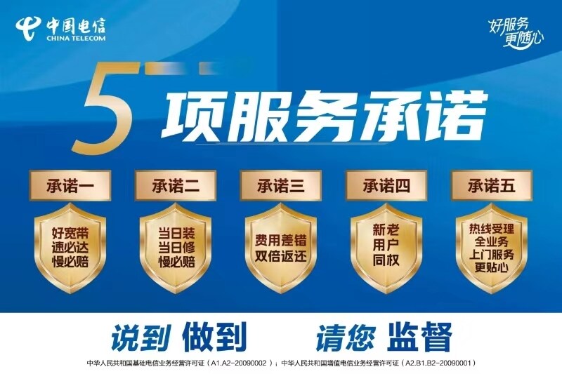 据了解,“新五项服务承诺”包括:承诺一:好宽带,速必达,慢必赔;承诺二:当日装,当日修,慢必赔;承诺三:费用差错,双倍返还;承诺四:新老用户同权;承诺五:热线受理全业务,上门服务更贴心。