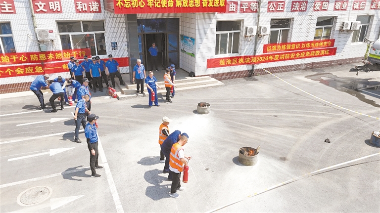 保定晚报讯(记者耿静)“不好了,后院垃圾桶起火!需要立即处理……”火灾预警信号发布后,消防应急演练队伍迅速赶赴现场组织抢险救援工作。6月17日,保定市莲池区城市管理综合行政执法局以“人人讲安全 个个会应急——畅通生命通道”为主题,组织全体执法人员开展夏季消防演练活动,以练为战,防患未然。