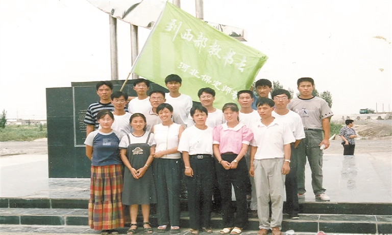 2000年8月,河北保定学院西部支教2000届毕业生群体壮志西行前往且末,在途经塔中沙漠公路时在入口处留影纪念。 且末县委宣传部供图