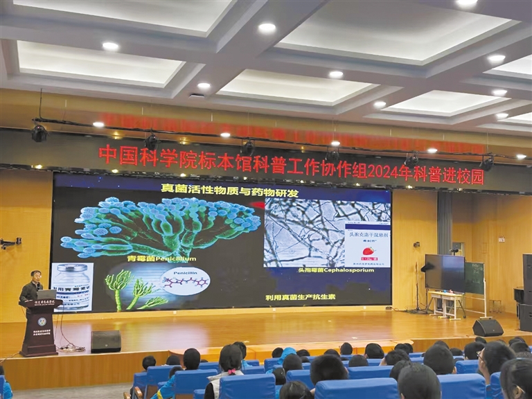 在保定市竞秀学校,中国科学院沈阳生态所标本馆的专家,给学生讲解生物多样性保护与真菌资源可持续利用。 保定市竞秀学校供图