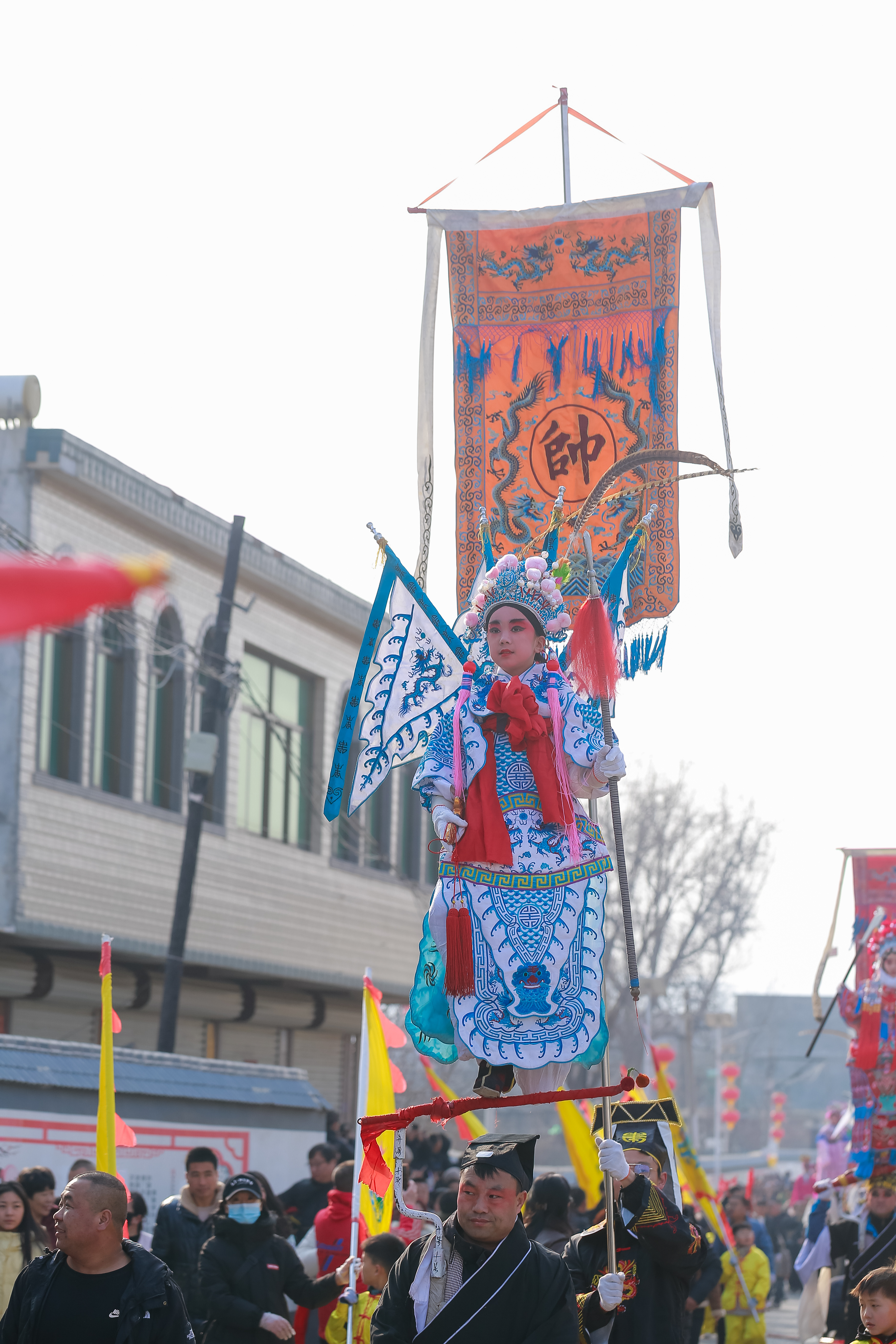 省级非物质文化遗产曲阳擎阁被称为“铁架上的大千世界”,几个强壮的成年人举着铁架上的孩童,沿街向大家送上新年祝福;十几位青壮年手持写有“国泰民安”“风调雨顺”等字样的大幡在大街上耍得惊险刺激、刚柔兼备,引得观众阵阵欢呼喝彩。