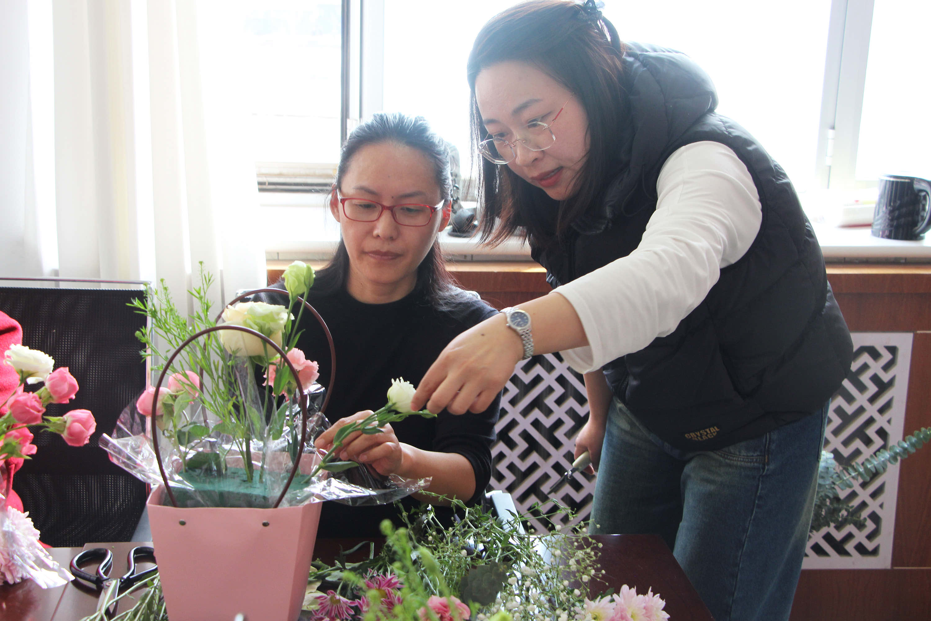 活动现场花香四溢,气氛热烈而温馨。花艺师围绕选花、配色、修剪、插花等方面讲解相关知识,并进行示范插花演示。在花艺师的细心指导下,大家兴致勃勃,手拿剪刀为鲜花修剪枝叶,精心构思,巧妙搭配,将一支支鲜花变成一个个精美的插花作品,幸福的笑容洋溢在每个人的脸上。“通过参加今天的活动,我学到了很多插花知识与技巧,并创作出自己喜欢的插花作品,很开心。”韩笑蕾拿着自己的插花作品笑着说。