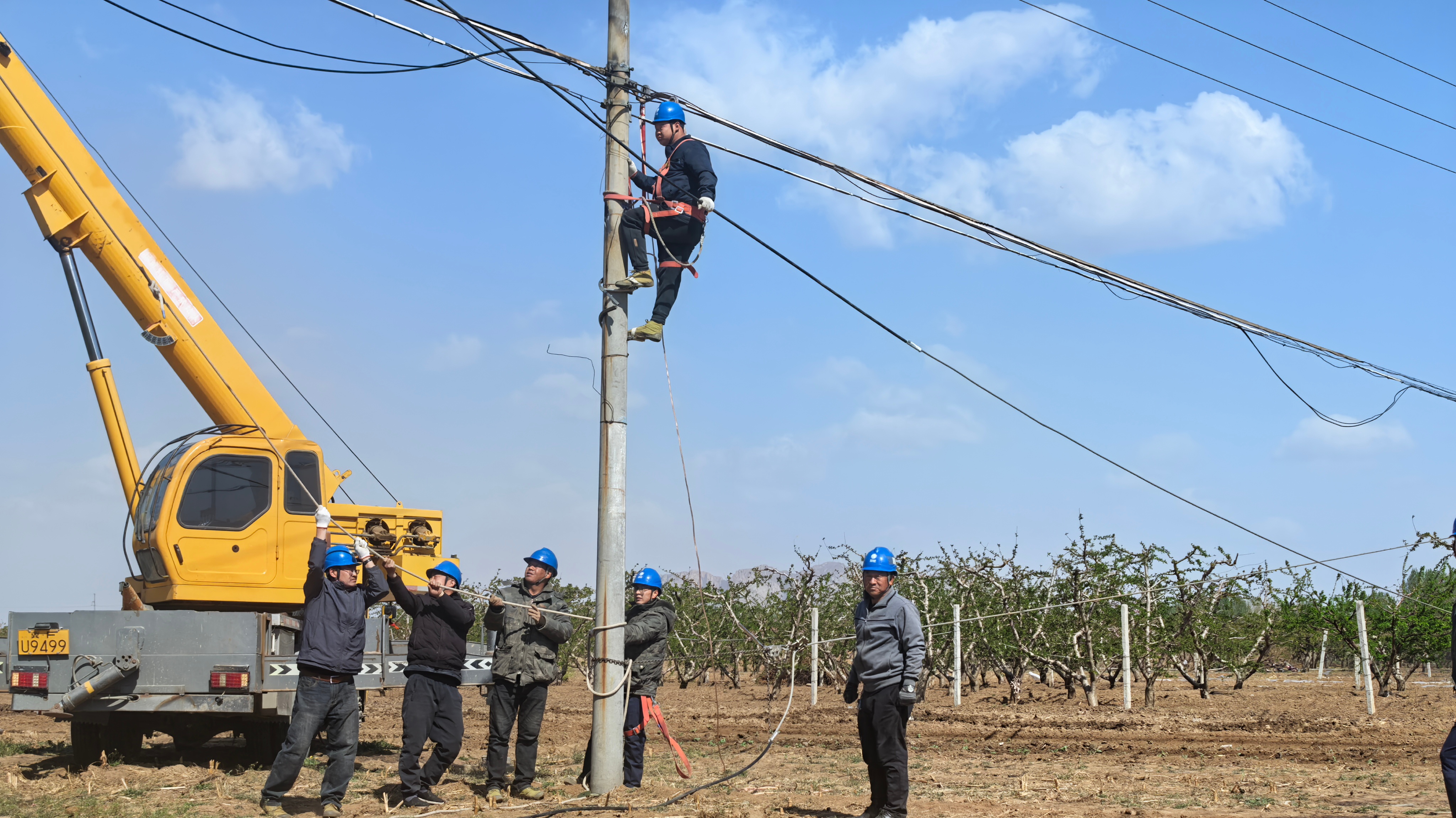 4月12日,国网曲阳供电公司员工抓紧对风毁线路故障进行修理。 郭敬坡 摄