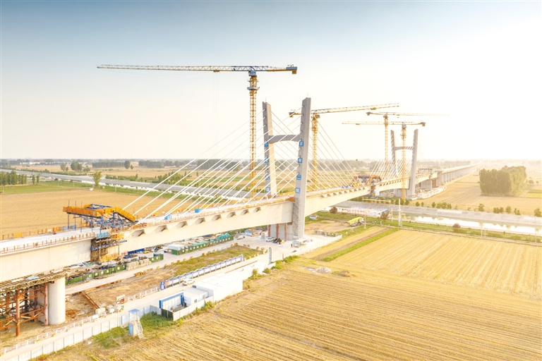 本次实现合龙的跨南水北调矮塔斜拉桥为雄忻高铁全线重要的控制性工程,大桥采用双塔双索面预应力混凝土矮塔斜拉桥设计,全长526.7米,塔高66.5米。