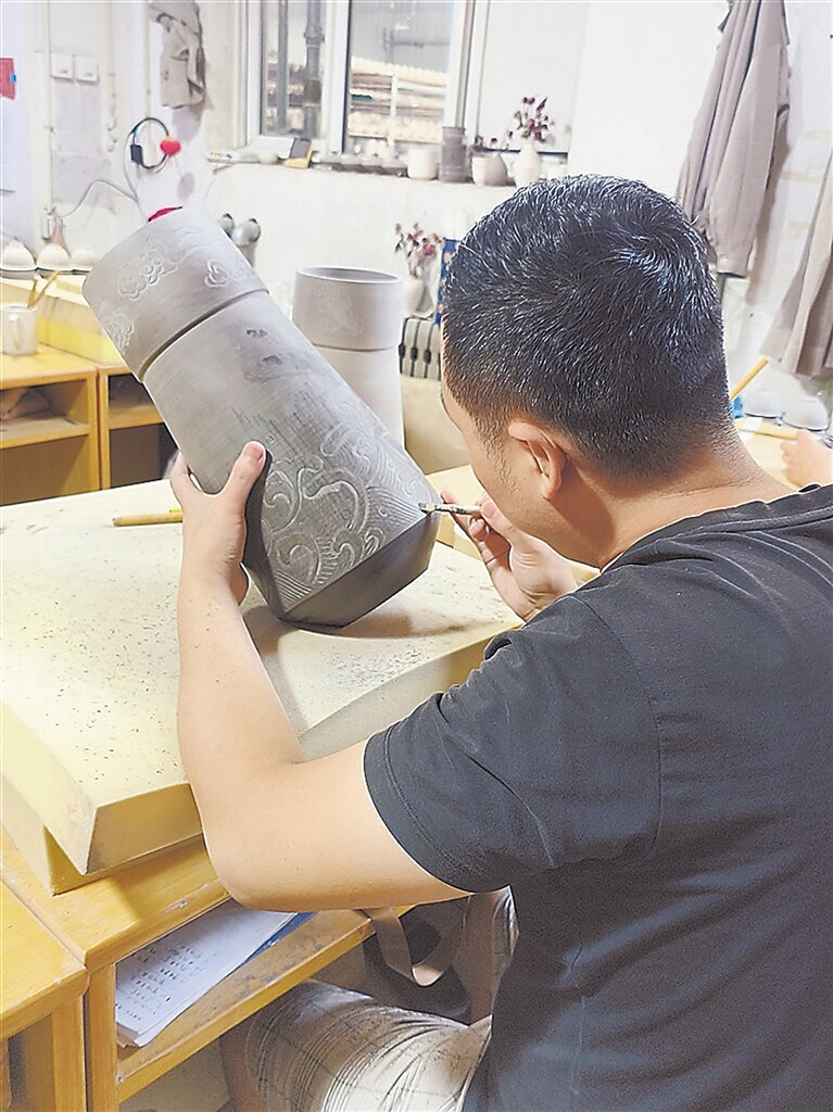 定瓷烧制技艺从业者正在专注雕刻花纹。 李萌 摄