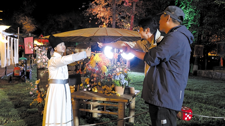 当踏入《遇见总督》情景剧的表演场地,游客瞬间被带入那段风云变幻的历史岁月。演员们的生动演绎将书本上枯燥的文字,鲜活地呈现在观众眼前。沿着古色古香的街道前行,民俗展演的热闹氛围扑面而来。舞者们身着绚丽的民族服饰,身姿轻盈曼妙,动作流畅自然,随着悠扬的音乐翩翩起舞,将《醉乡》的柔情与美好展现得淋漓尽致。一曲舞罢,琵琶、二胡合奏《兰亭序》的悠扬旋律在夜空中缓缓流淌,在这古意盎然的太行水镇,聆听着充满诗意的旋律,游客们仿佛看到文人墨客饮酒赋诗、畅谈人生的惬意场景,心灵也在这一刻得到宁静与慰藉。“我第一次来易县,赶上旅发大会,在太行水镇,有演出、有灯光秀,人还特别热情,这一趟特别值。”来自天津的游客付尧说。